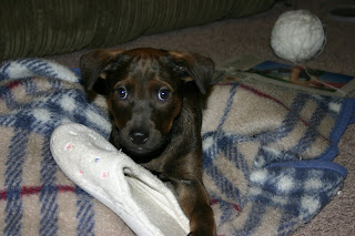 She is almost 13 weeks old, and has been our pup for six weeks, and I adore her and she knows it. She is most definitely my puppy. Most often, I feed her and clean up after her and she whines when she can't follow me around the house (biting my feet or hanging off of my pant leg). She seems to identify Jack as the pack leader and everybody else in her world is simply a sibling, another member of the pack to jump on and chew on. And while she loves to chew on her big sheep (it was a gift to Jessie when she was maybe two?) and her little squeaky sheep, her kong puppy chew toy and her old navy puppy, any ball or sock or shoe or slipper she sees, her favorite thing to chew on is clearly me and when she isn't chewing on me, she's leaping around me trying to figure out how to jump up and chew on me.